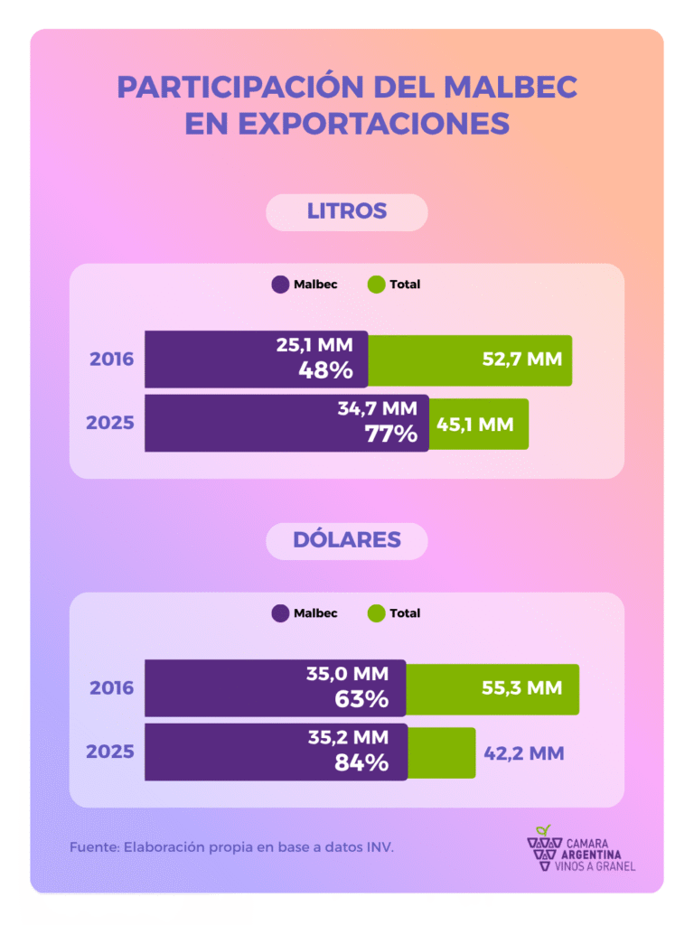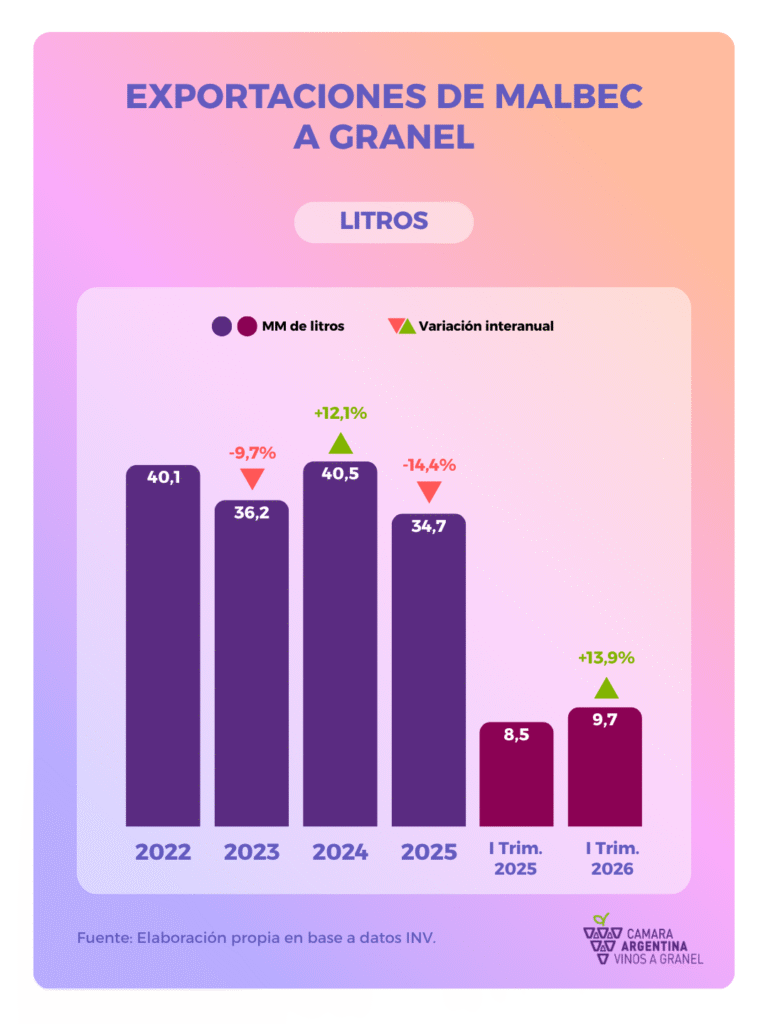 Con motivo del reciente Día Mundial del Malbec, la Cámara Argentina de Vinos a Granel dio a conocer datos que reflejan la relevancia del varietal en el negocio de exportación en grandes volúmenes. Durante 2025, las exportaciones argentinas de Malbec a granel alcanzaron 34,7 millones de litros y USD 35,2 millones, lo que significó una caída del 14,4% en volumen y del 19,8% en valor respecto al año anterior.