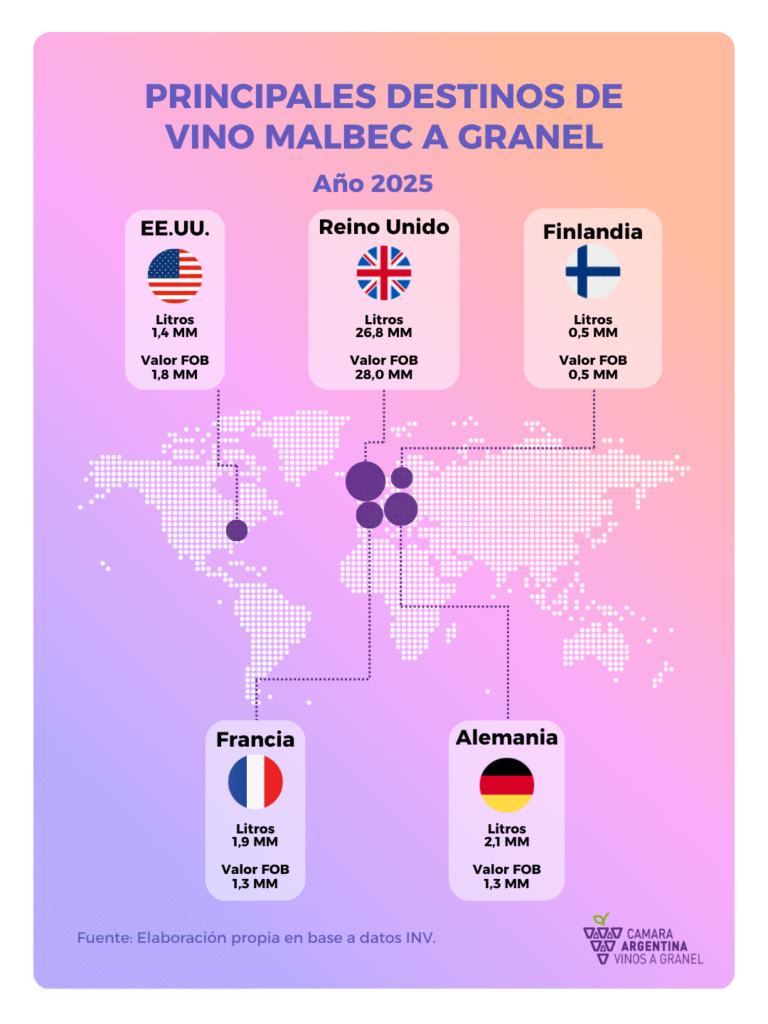 El Reino Unido se mantiene como destino dominante: en 2025 absorbió el 77,1% de los envíos (26,8 millones de litros). Le siguieron Alemania (5,9%), Francia (5,4%), Estados Unidos (3,9%) y Finlandia (1,5%). En total, el Malbec llegó a 20 mercados, sumando nuevos destinos como Hungría, Colombia y Chile.